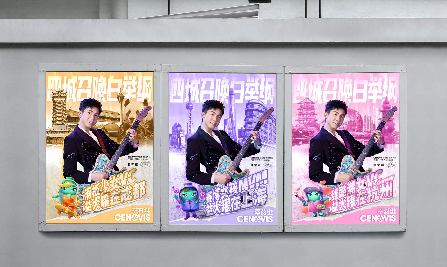 CENOVIS萃益维代言人白举纲「四城召唤」活动主视觉海报,结合不同产品特点代表四个热门城市的特色,在各平台进行宣传,音乐会现场的搭建以及周边手环、门票、宣传大巴的视觉包装。